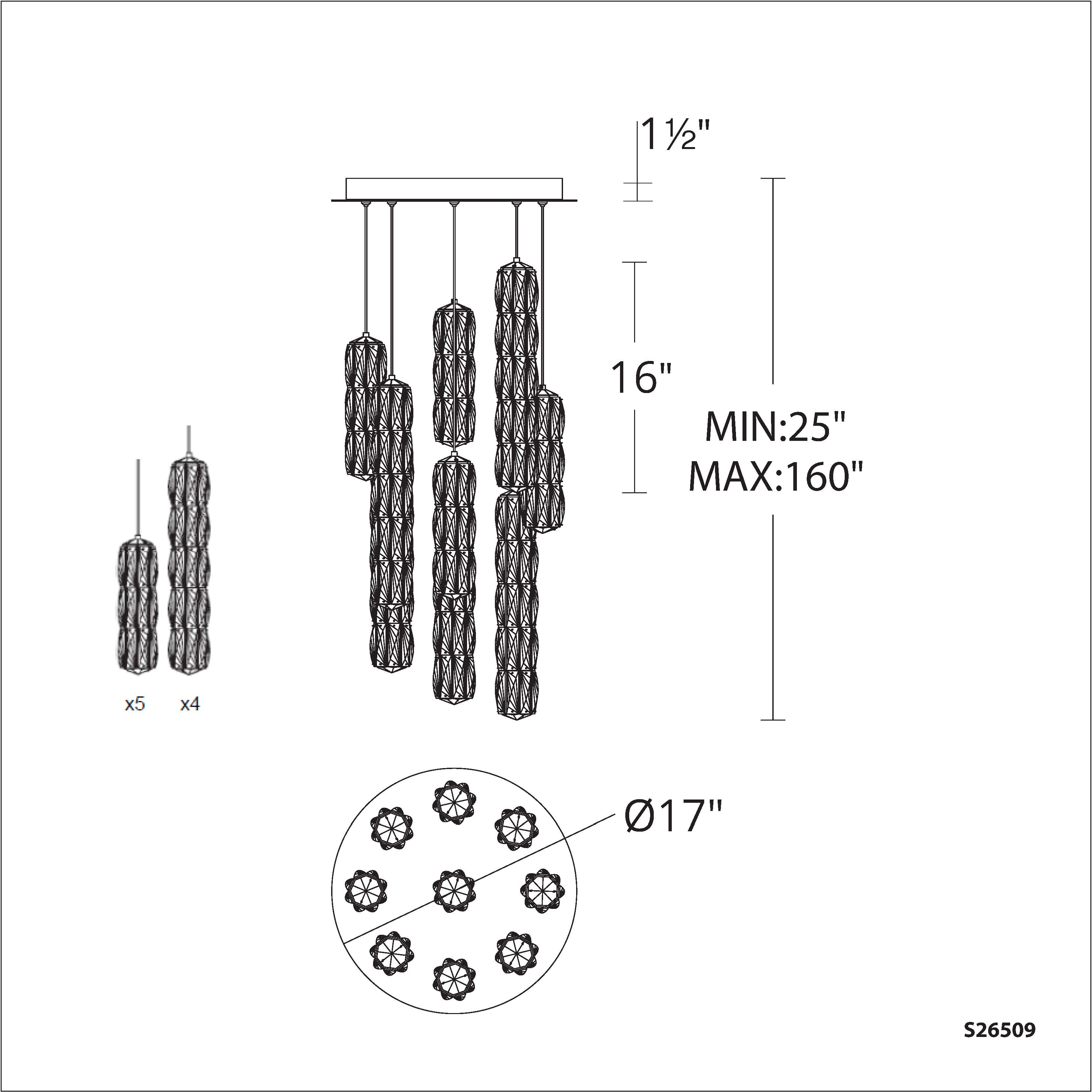 Cylinders of Radiance® Crystals with a resplendent backlit style presents the Verve Collection with an energizing presence that scatters bright starbursts of LED illumination. Nine Verve pendants are installed on one round canopy to make a modern statement in any space.